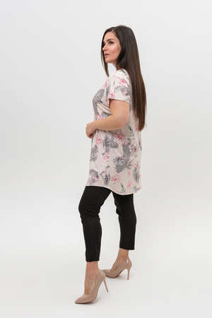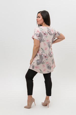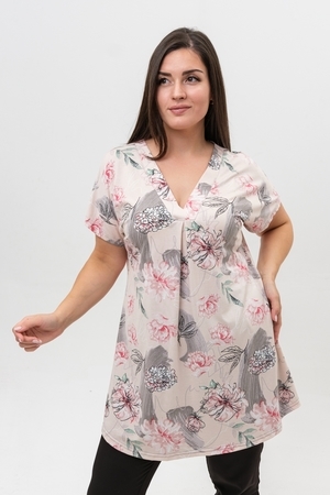 Туника женская со спущенным плечом выполнена из вискозы красивой нежной расцветки. Горловина с V-образным вырезом обработана планкой, низ изделия немного расклешен. Ткань при стирке не линяет, не дает усадки, сохраняет форму. Туника подойдет для прогулок, дома и отдыха.
