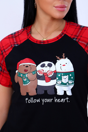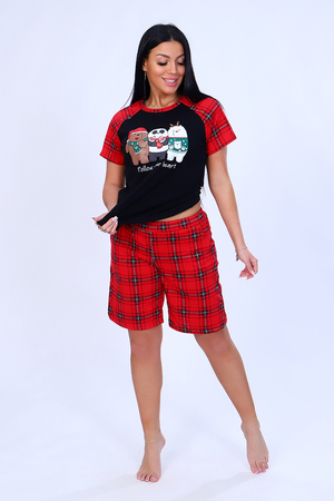 Костюм состоит из футболки с коротким рукавом прямого кроя и удлиненных шорт, новогодний принт на полочке