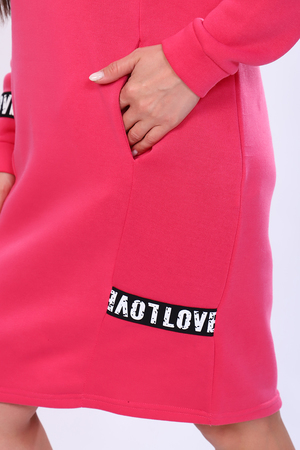 Комплект одежды платье + шапка. Платье прямого силуэта, с капюшоном на шнуровке через люверсы. Длинный рукав на манжетах, на одном рукаве декоративная надпись. На передней полочке внутренние карманы и декоративная надпись. Шапка с отворотом и декоративными ушками. Размер шапки 46-60. Удобно и практично.