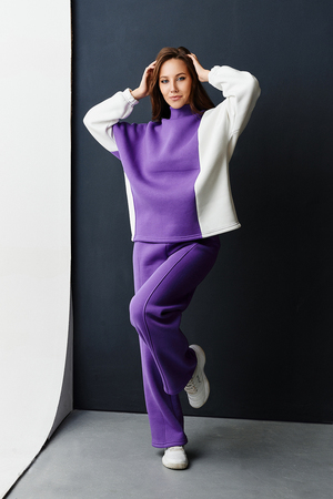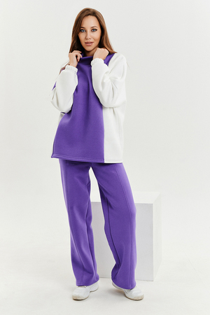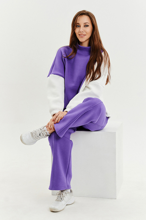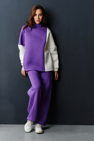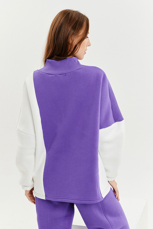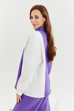 Свитшот oversize женский. Материал - футер с начёсом. Сезон - осень-зима. Свитшот выполнен в технике Color Block (цветовые блоки). Модель свободная, объемная, прямого силуэта. Горловина выполнена из кашкорсе. Рукав со спущенной проймой, манжета на резинке. Рукава разного цвета. По бокам полочки - разномасштабные, округлые вставки.