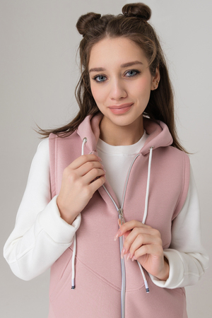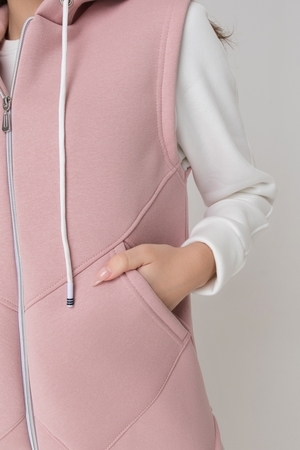 Жилет утепленный, прямой, на молнии, с капюшоном, с фигурной линией низа. Полочка с фигурными кокетками и удобными накладными карманами.