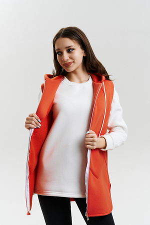 Жилет утепленный, прямой, на молнии, с капюшоном, с фигурной линией низа. Полочка с фигурными кокетками и удобными накладными карманами.