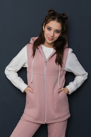 Жилет утепленный, прямой, на молнии, с капюшоном, с фигурной линией проймы. Полочка и спинка с кокетками, В нижней части полочки расположены накладные карманы.