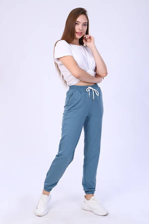 Женские брюки из качественного трикотажного полотна футер 2-х нитка. Пояс прошитый на резинке на регулированном шнурке. Изделие с боковыми карманами, низ брюк на резинке.