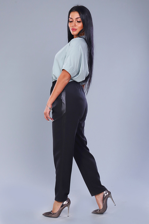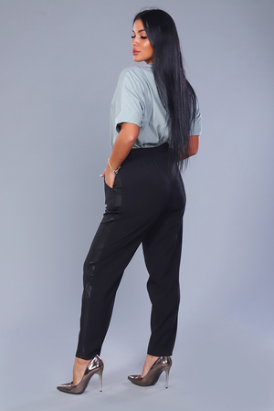 Классические черные брюки с лампасами из ткани - имитации кожи. Брюки будут актуальны практически везде: работа, деловая встреча, прогулка, торжественный случай, смотря с каким верхом их комбинировать. Благодаря высокой посадке и  широкому поясу на резинке, изделие  хорошо сядет на любую фигуру. Брюки заужены книзу, по бокам внутренние карманы. Ширина лампаса - 3,5 см. В замерах объем талии соответствует длине пояса в растянутом виде.