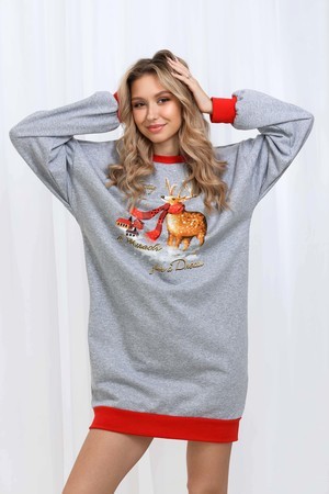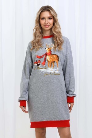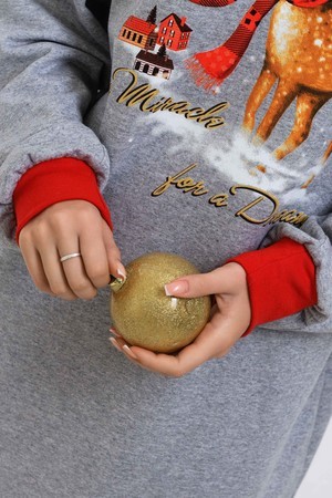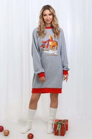 Олени - неотъемлемый атрибут Рождества. Традиция использовать в новогоднем убранстве рождественских оленей завоевала большую популярность во всём мире. В этой уютной удобной домашней тунике из футера двух нитки с начёсом комфортно находиться в домашней обстановке. В ней можно встретить праздник, использовать в повседневной носке и в качестве подарка. Туника свободного кроя, рукава с напуском. Все манжеты на изделии выполнены из плотной рибаны с лайкрой. Длина рукава в измерениях указана от основания шеи.