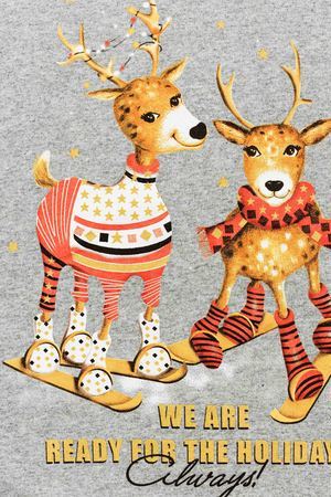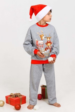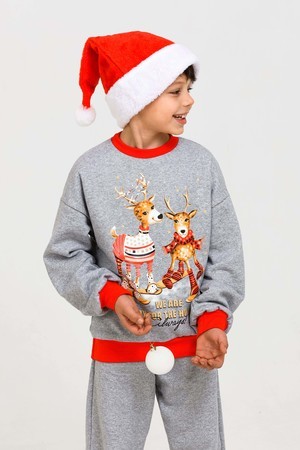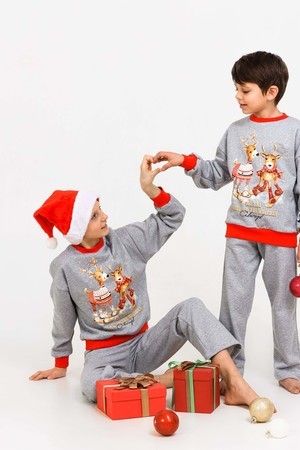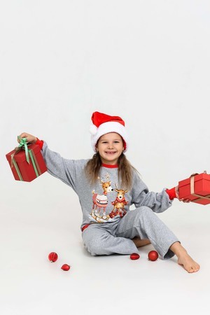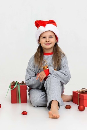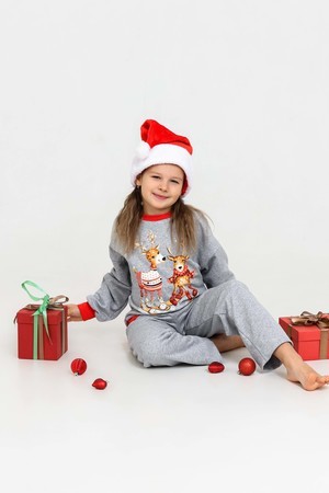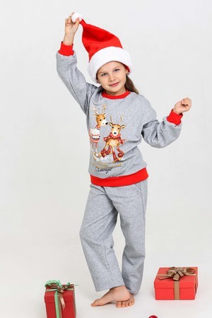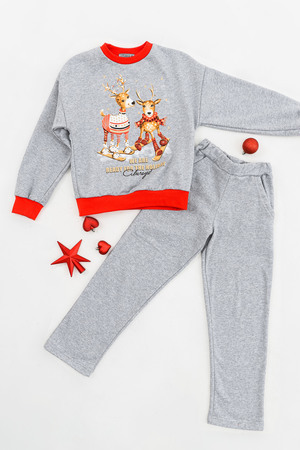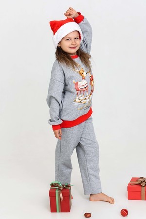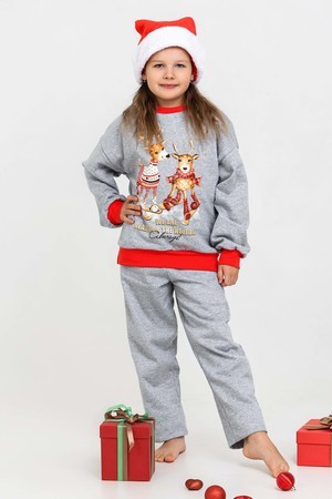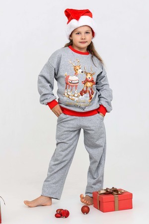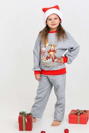Костюм домашний для детей, подходит как для девочек, так и для мальчиков. На свободном свитшоте изображены весёлые олени, что создаёт атмосферу праздника. Брюки прямые, с боковыми карманами. Манжеты выполнены из плотной резинки - рибаны с лайкрой. Пояс на широкой резинке. Материал приятный к телу. В таком костюме можно встретить праздник, использовать в качестве подарка на Новый год или Рождество. А также в нём можно находиться в домашней обстановке для создания хорошего настроения.