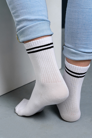 Стильные женские носки в лаконичных расцветках с контрастными полосами. В упаковке 3 пары одного цвета на выбор - белого или черного. Отлично сочетаются с любой обувью - лучший вариант на каждый день