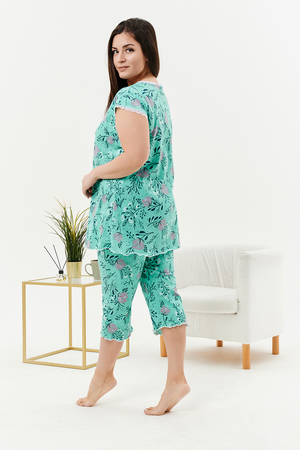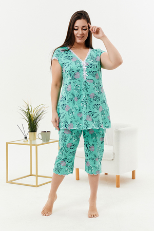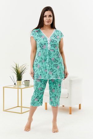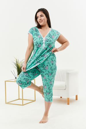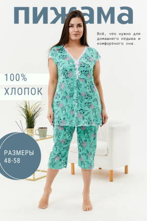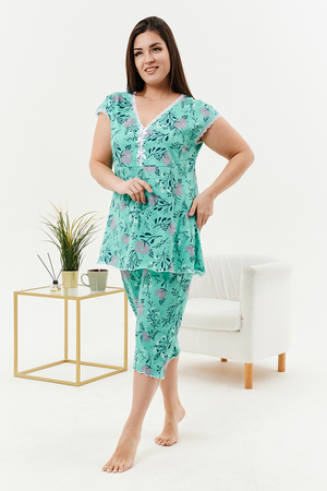 Пижама женская состоит из майки и бриджей, состав 100% хлопок. Майка прямого кроя с кружевной отделкой, низ обработан декоративной строчкой. Бриджи прямого кроя, внизу декоративная строчка. Легкая в уходе.