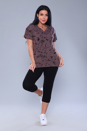 Практичная и удобная модель для энергичных хозяек. В состав комплекта входит футболка с короткими рукавами и однотонные бриджи длиной до середины икры. Футболка имеет V-образный вырез. Бриджи имеют удобную посадку на резинке.