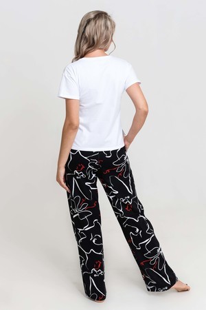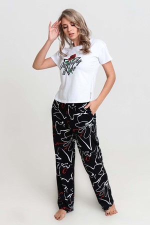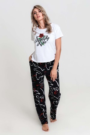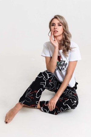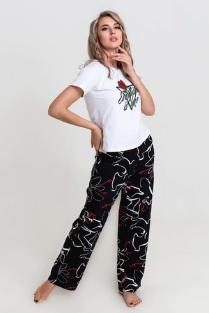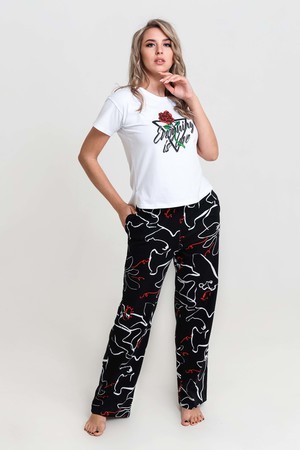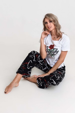 Пижама женская из хлопка от Российского производителя. Футболка 95% хлопок,5% лайкра. Брюки 100% хлопок. Пижама домашняя для сна. Белая футболка укороченная с принтом роза и надписью. Брюки с карманами, пояс на резинке со шнурком. Футболка с брюками подойдут как для повседневного ношения, домашнего времяпрепровождения и комфортного сна. Приятная к телу вещь порадует Вас уютом и комфортом. Отличный подарок сестре, дочери, маме, жене, подруге.