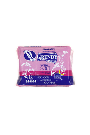 Ночные гигиенические прокладки GRENDY ULTRA. Ультратонкие (0,6 мм) гигиенические прокладки «Grendy» ночного применения с «крылышками», препятствующие протеканию. Содержат слой extra soft либо extra dry. В одной упаковке 8 шт.