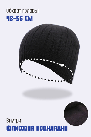 Шапка мужская демисезонная, вязаная, без отворота с подкладкой из флиса. Изготовлена из 70% акрила, 20% шерсти, 5% полиамида и 5% спандекса. Плоские швы - остаются незаметны и не натирают, позволяя носить шапку продолжительное время Флисовый подклад - дополнительное утепление в холодную погоду и защита от ветра. Шапка прекрасно подойдет для повседневной носки, а также для занятия спортом на осень, весну и в теплое время зимой. Комфортно садиться на объем головы от 48 до 56 сантиметров.