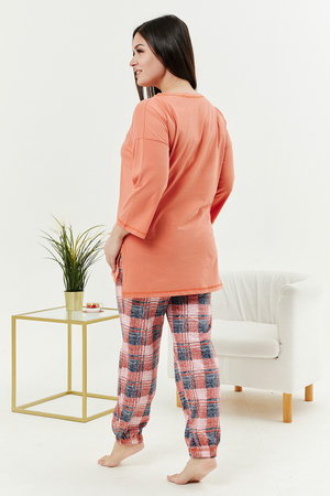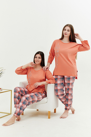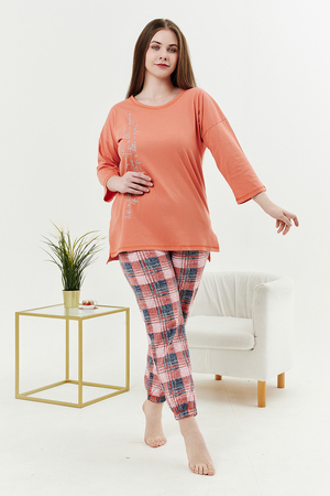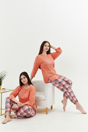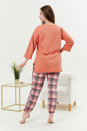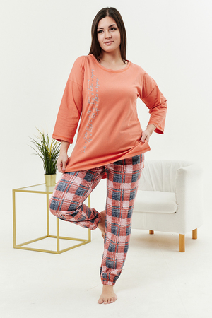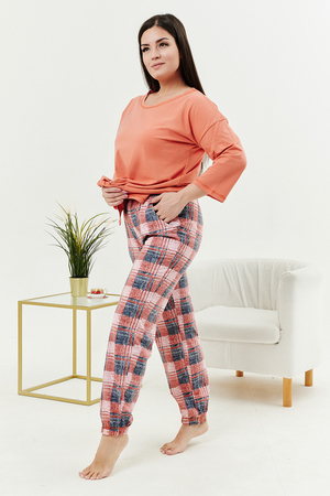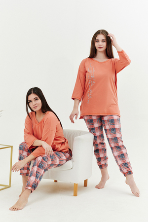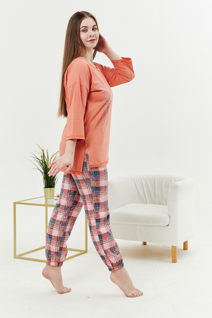 Костюм женский: туника и брюки. Туника прямого силуэта с округлой горловиной, в боковых швах разрезы, на полочке стильный принт. Брюки из ткани в клетку, на поясе, простроченном на многоигольной машине. Низ брюк собран на эластичную тесьму. На передней половинке брюк внутренние карманы.