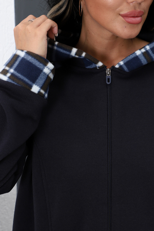Толстовка женская утепленная на молнии с капюшоном. Длинный рукав на манжете, на передней полочке рельефы, в которых расположены карманы. Практично и удобно. В бежевой расцветке возможны вставки коричневого и рыжего цветов.