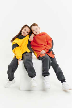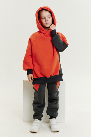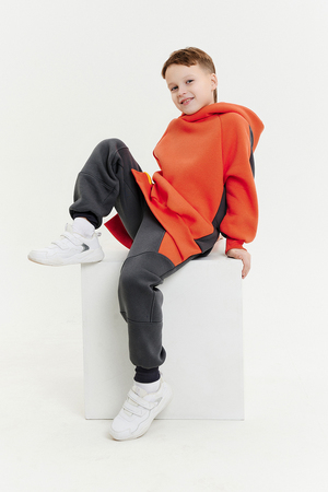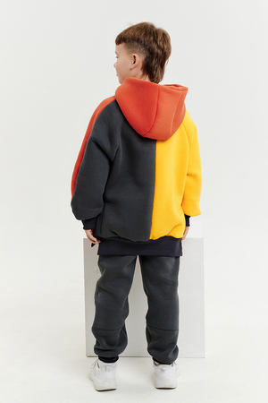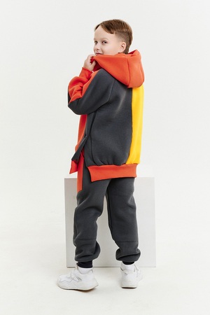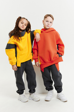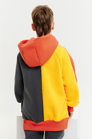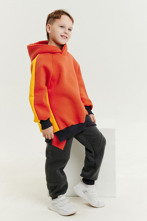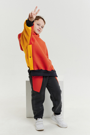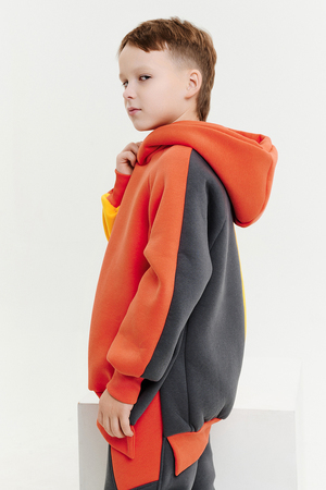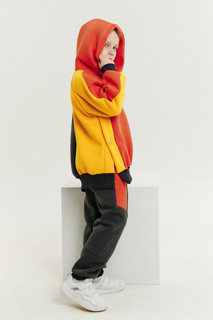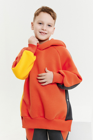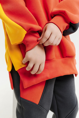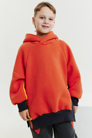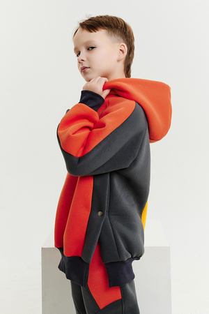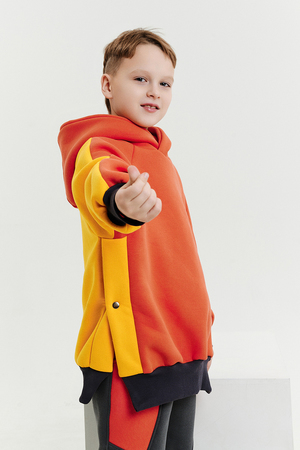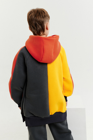 Худи oversize детская, unisex. Материал - футер с начёсом. Худи выполнена в технике Color Block (цветовые блоки). Модель свободного покроя, с большим, уютным капюшоном. Силуэт - трапециевидный, изделие заужено к низу. Рукав - реглан, манжета на резинке-кашкорсе. Нижний пояс также изготовлен из кашкорсе, нет стягивающего эффекта. По бокам - планки на застёжке-кнопке, разного цвета. Спинка со швом, также разделена на цветовые блоки.