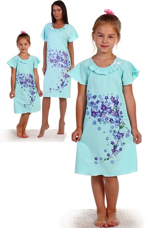 Сорочка из кулирки для девочек. Две расцветки — розовая и ментоловая. Воротник спереди отделан рюшами. Принт в виде цветов. Короткие широкие рукава. Общая длина сорочки приблизительно до коленей. Может быть парой женской сорочке Водопад (продается отдельно).
