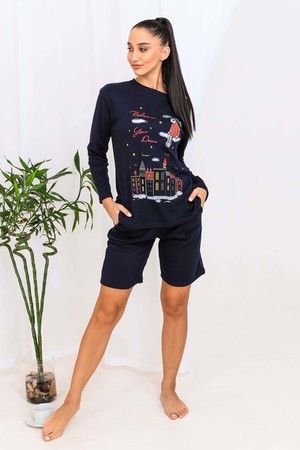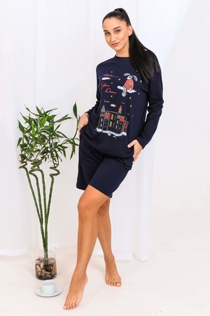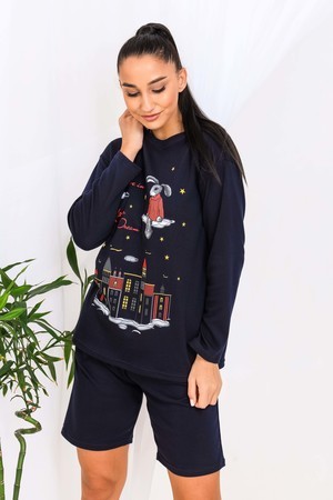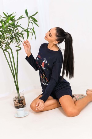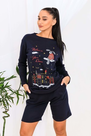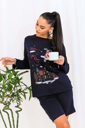 Домашний костюм, состоящий из лонгслива и удлинённых шорт. Костюм изготовлен из ткани высокого качества интерлока пенье. Пенье-это полотно, при производстве которого используют самые лучшие длинные нити. На интерлоке пенье не образовывается затяжек, катышков и прочих неприятностей, эта ткань всегда выглядит безупречно. Мягкий натуральный хлопок гипоаллергенен, не раздражает кожу и позволяет ей дышать. На лонгсливе изображены замок и заяц, которые создадут атмосферу волшебства в вашем доме. Лонгслив свободного кроя, шов на горловине обработан киперной лентой. Особенности кроя шорт: высокая посадка, свободный крой, боковые карманы, пояс прошит на поясной машине. Рекомендации по уходу: бережная стирка до 30 градусов, деликатный отжим, не выкручивать, отбеливание запрещено, гладить со стороны изнанки. Такой костюм вам подарит ощущение сказки.