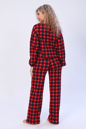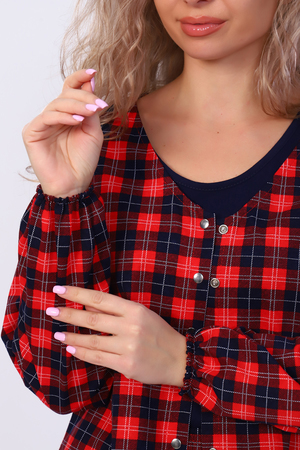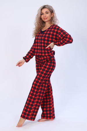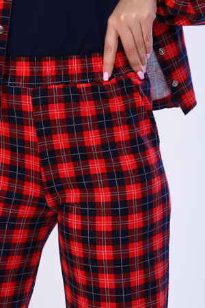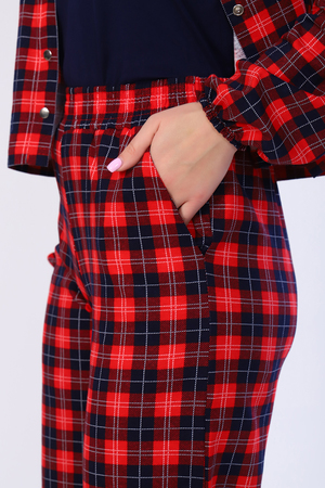 Женский костюм 3-ка из 100% хлопчатобумажного полотна в клетку - это идеальный вариант поднять настроение себе и окружающим! Стильный домашний комплект с брюками - незаменимая вещь в гардеробе каждой модницы. Костюм состоит из рубашки, майки и брюк палаццо. Рубашка с V-образным вырезом, длинным рукавом на резинке и застёгивающаяся на современные кнопки. Майка классическая, однотонная, без рукава. И конечно брюки палаццо успешно конкурирующие с другими моделями. Пояс брюк выполнен на специализированной поясной машине, по бокам имеются вместительные карманы. Комплект хорошо садится на любую фигуру, удобный крой позволяет чувствовать себя свободно, а всеми любимая расцветка придаёт образу лёгкость и романтичность.