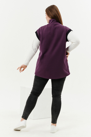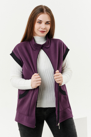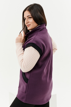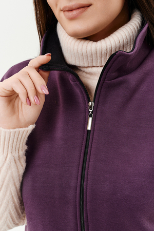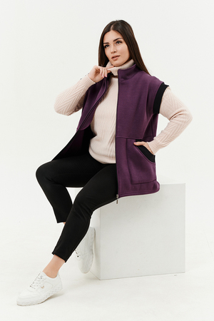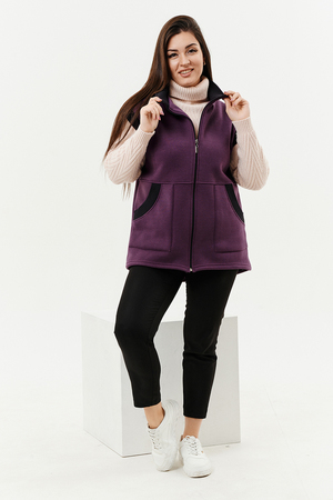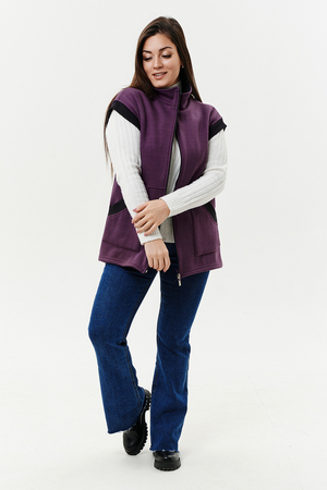 Жилет женский прямого силуэта. Застежка на тесьму - молнию. Воротник - стойка. На полочке два накладных кармана. Обтачки пройм, фигурного входа в карман и нижний воротник из кашкорсе контрастного черного цвета. Спинка немного длиннее полочки. Женщина в этом жилете будет выглядеть стильно и одновременно защищена от холода.