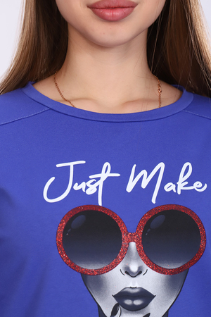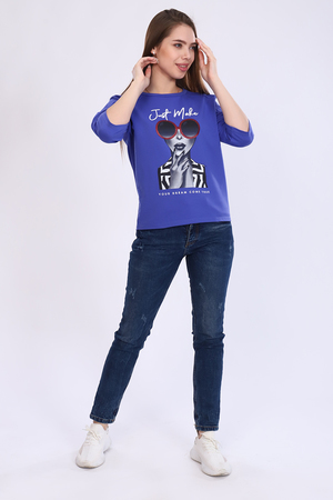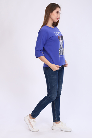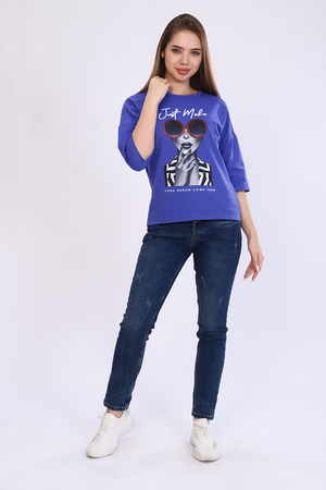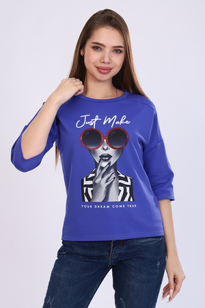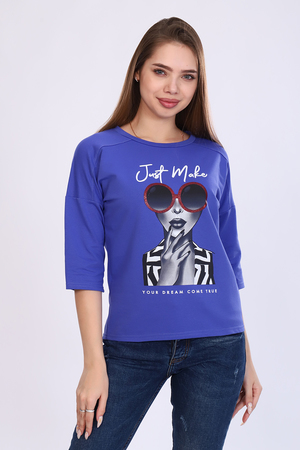 Джемпер женский с ярким, оригинальным принтом из мягкого футера с лайкрой 2-х нитка. Модель слегка приталенного силуэта, круглая горловина обработана обтачкой, спущенная пройма, свободный 3/4 рукав, на спинке кокетка, низ слегка удлинён и закруглён. Стильный, комфортный джемпер необходимая вещь в гардеробе деловой, современной девушки, отличный офисный вариант, хорошо будет смотреться как с брюками, так и с юбкой.