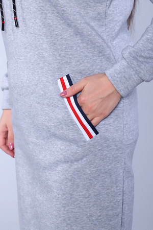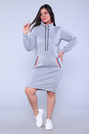 Платье женское комбинированное из футера прямого силуэта. Длинный рукав ма манжете, воротник стойка на шнуровке через люверсы. На передней полочке внутренние карманы с отделкой. Теплое и удобное.