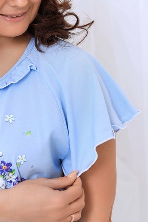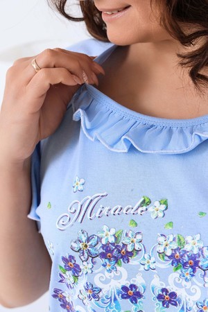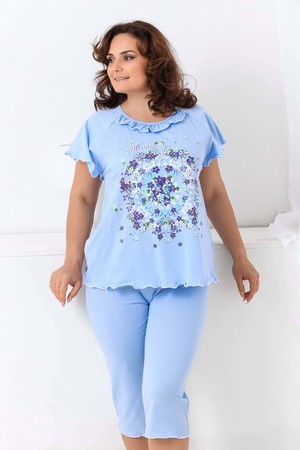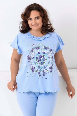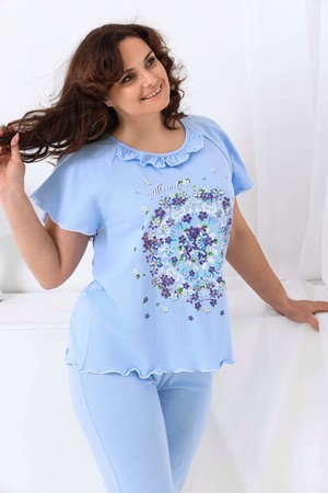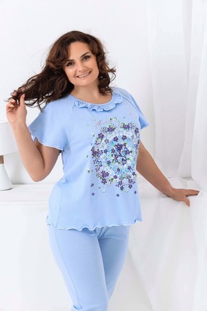 Пижама женская с симпатичной рюшей по горловине. Очень свободный и удобный крой. Рукав-реглан не стесняет движение рук. Обработка рукава и низа изделия в виде лёгкой волны придаёт лёгкость и воздушность. Шикарный принт в виде орнамента из россыпи цветов. Оттенок ментола может отличаться от фото.
