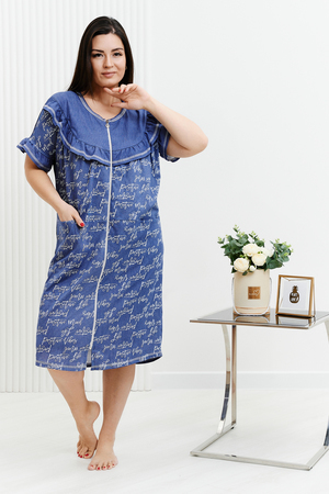 Халат женский, полуприлегающего силуэта, горловина округлая, застежка на тесьму-молнию. На полочке кокетка с рюшей, также рюша внизу цельнокроенного короткого рукава из отделочной ткани. Внутренние горизонтальные карманы в шве стачивания верхней и нижней части полочки.