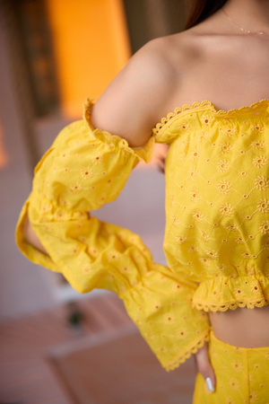 Молодежный костюм состоит из топа с открытыми плечами и с длинными рукавами, и мини юбки.
