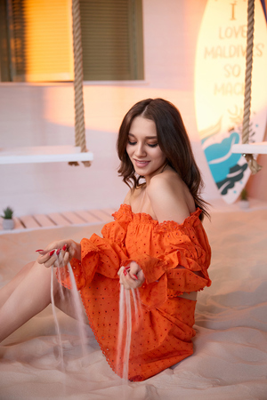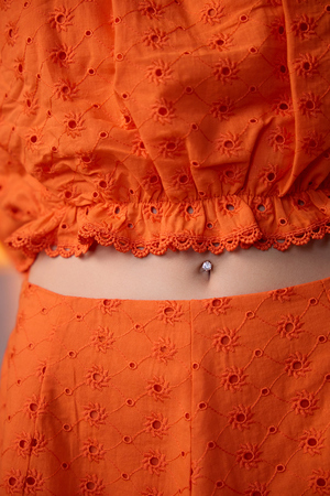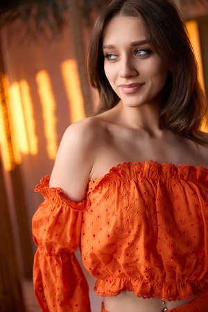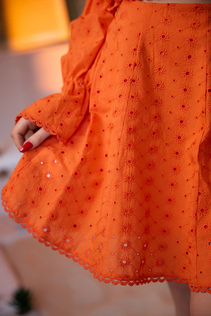 Молодежный костюм состоит из топа с открытыми плечами и с длинными рукавами, и мини юбки.