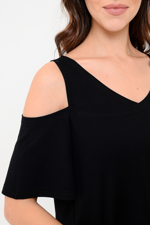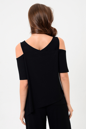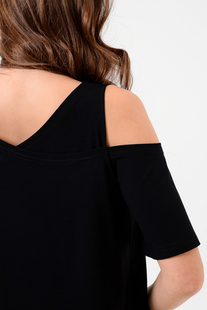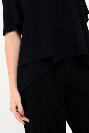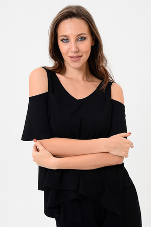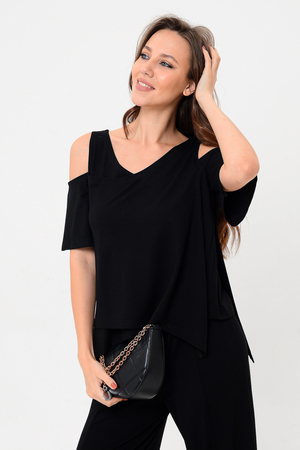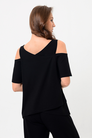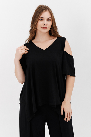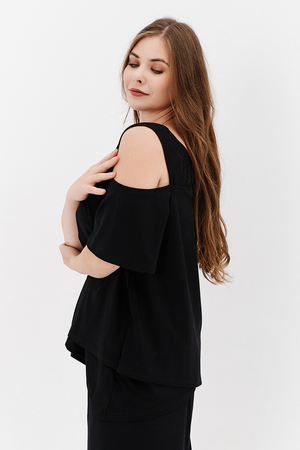 Дизайнерская женская блузка свободного кроя. Её можно носить как вечернюю или офисную, так же подойдет для жаркой погоды. Модель выполнена из приятной на ощупь дышащей ткани, не просвечивает. Особенностью блузки являются двойные полочка и спинка. Рукав с открытым плечом.