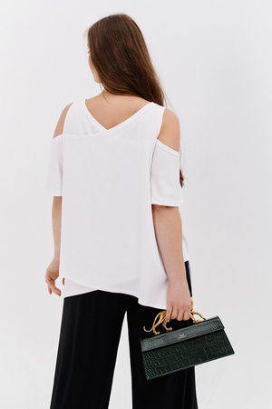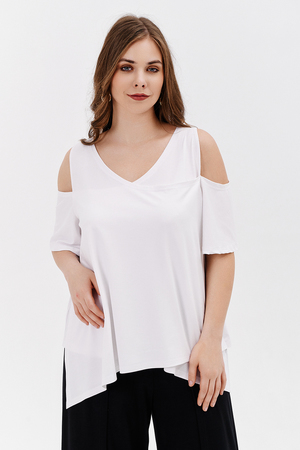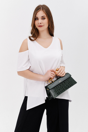 Дизайнерская женская блузка свободного кроя. Её можно носить как вечернюю или офисную, так же подойдет для жаркой погоды. Модель выполнена из приятной на ощупь дышащей ткани, не просвечивает. Особенностью блузки являются двойные полочка и спинка. Рукав с открытым плечом.