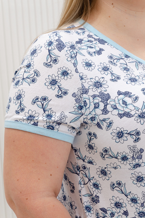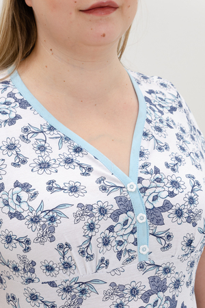 Сорочка женская из кулирного полотна, 100% хлопок. На полочке разрезная кокетка, горловина обработана окантовкой, на планке декоративные пуговицы, низ рукавов окантован, низ изделия обработан на плоскошовной машине. Сорочка удобна и комфортна для сна. Легкая в уходе.