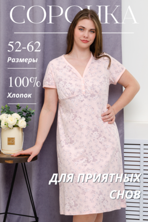 Сорочка женская из кулирного полотна, 100% хлопок. На полочке разрезная кокетка, горловина обработана окантовкой, на планке декоративные пуговицы, низ рукавов окантован, низ изделия обработан на плоскошовной машине. Сорочка удобна и комфортна для сна. Легкая в уходе.
