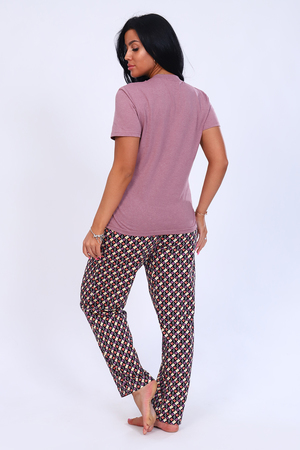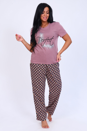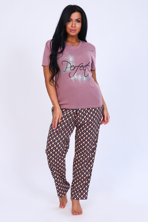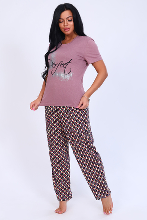Женский домашний комплект состоит из футболки и брюк. Футболка слегка приталенного силуэта с короткими рукавами, горловина круглая, обработана обтачкой. Брюки прямого силуэта с притачным поясом.