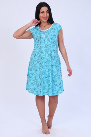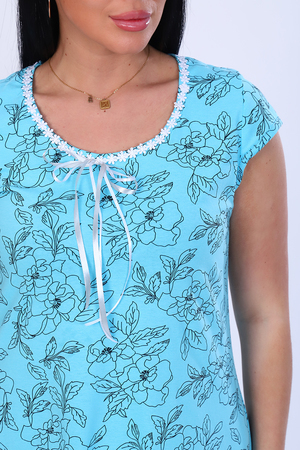 Сорочка женская из хлопковой трикотажной кулирки. Горловина круглая, украшена шитьем из белых ромашек, на полочке двойной бантик, подол изделия - широкий, рукава короткие.