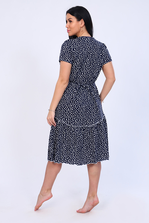 Халат из набивной кулирки в мелкий горох, прямого силуэта на молнии. Длина ниже колена, рукав короткий. Карманы украшены кружевом.