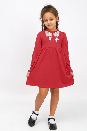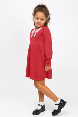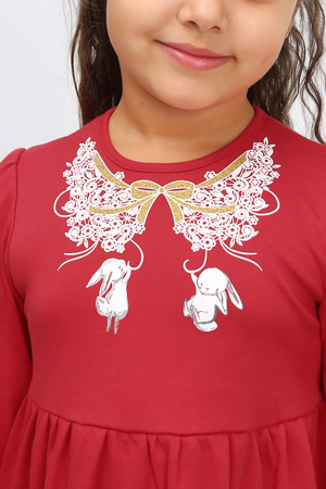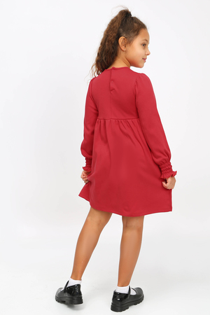 Платье из хлопковой ткани, отрезное выше талии. Рукав втачной с небольшой сборкой по окату и на манжете с резинкой и рюшей внизу. Нижняя часть - в сборку. Горловина отделана окантовкой из этой же ткани. Для удобства одевания на спинке предусмотрена планка на кнопках. Полочку украшает шелкография. Ткань гипоаллергенная, хорошо пропускает воздух.