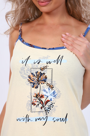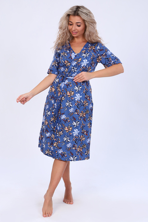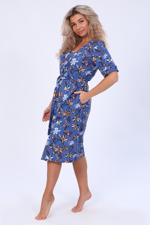 Женский пеньюар состоит из халата и сорочки. Сорочка прилегающего силуэта на тонких бретелях с принтом на полочке. Халат запашной с поясом, рукава короткие на манжетах, карманы в боковых швах. Комфортный комплект для отдыха и сна.