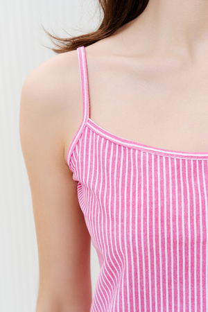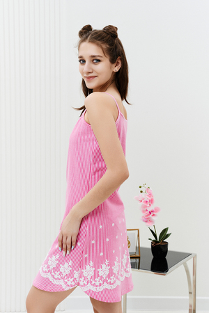 Сорочка на бретелях полуприлегающего силуэта, с фигурной линией низа, длиной выше колена. На полочке внизу обработан декоративный разрез. Проймы, бретели и разрез на полочке обработаны бейкой из основного полотна.