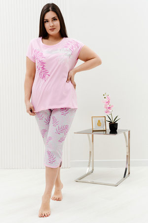 Костюм женский состоит из футболки и бриджей из кулирного полотна. Футболка прямого кроя, горловина круглая, спущенное плечо, на полочке принт, низ изделия обработан на плоскошовной машине. Бриджи прямого кроя, верх на поясе с широкой резинкой, в боковых швах прорезные карманы, низ изделия обработан окантовкой. Такой комплект отлично подходит на каждый день, легкий в уходе. Рост модели на фото 165 см, размер 48