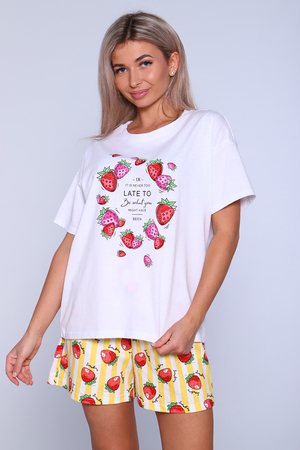 Хлопковый женский костюм состоит из свободной футболки и шорт свободного кроя. Футболка с ярким принтом подарит хорошее настроение. Шорты на резинке с веселым рисунком. Из-за своего натурального состава данный костюм домашний женский может использоваться как пижама. Ткань очень приятная к телу.