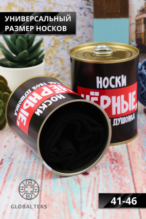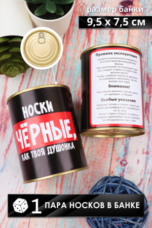 Внутри банки носки мужские 1 пара, состав 80% хлопок, 15% полиамид, 5% лайкра, универсального размера 41-46. Использование высококачественного материала позволяет коже "дышать", а добавление небольшого количества синтетических нитей делает носки долговечней.
