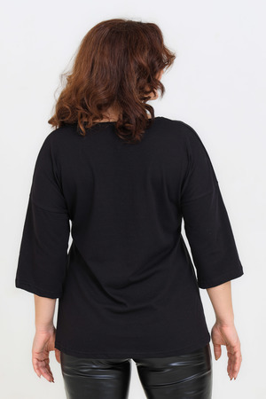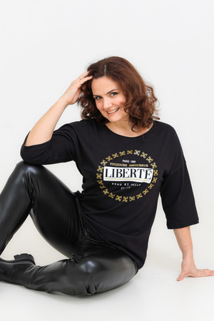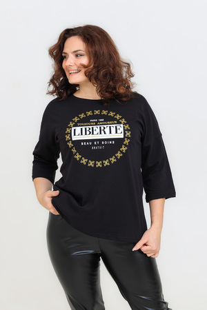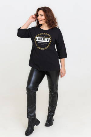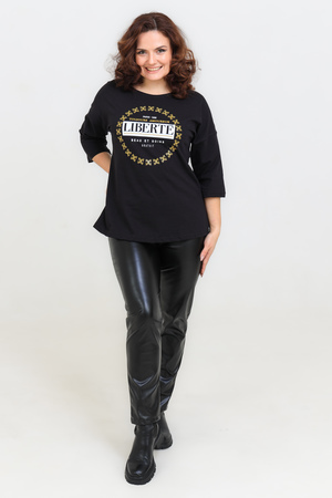 Женская футболка свободного кроя длиной до середины бедра с круглым вырезом горловины. Базовые цвета - белый и черный прекрасно впишутся в любой образ. Модели средней длины прекрасно смотрятся с брюками-дудочками или облегающими джинсами. В прохладную погоду хорошо будет смотреться в паре с утепленной жилеткой или курткой. Принт из золотого глиттера выигрышно смотрится на белом и черном цвете.