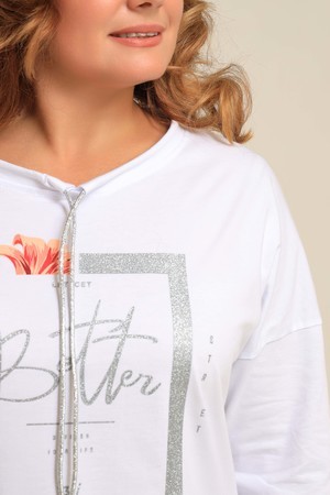 Удлиненная женская футболка со шнурком, длиной до середины бедра с округлым вырезом горловины. Представленная в цветах - красный, фисташковый, лиловый, молочный и черном не утратят своей актуальности. Модели средней длины прекрасно смотрятся с брюками - дудочками или облегающими джинсами. В прохладную погоду хорошо будет смотреться в паре с утепленной жилеткой или курткой. Принт из блестящего глиттера прекрасно гармонирует с серебристым шнурком. Модель выполнена из хлопка высшего качества. Размер на модели 48. Параметры 105-86-98/169