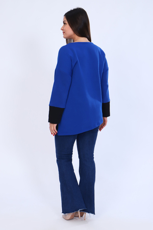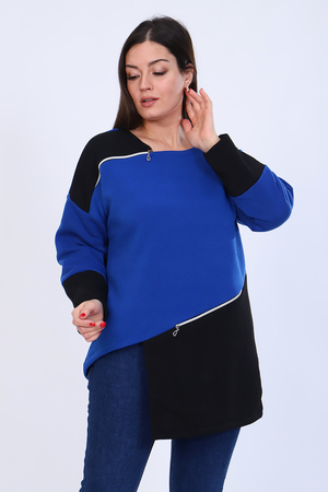 Туника женская, комбинированная, прямого силуэта, спущенный рукав 3/4 с широкими манжетами, длина рукава от шва. Горловина с обтачкой, справа декорирована втачной молнией. Фигурный v-образный низ декорирован вшивной молнией. Удобно и практично.