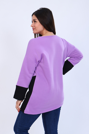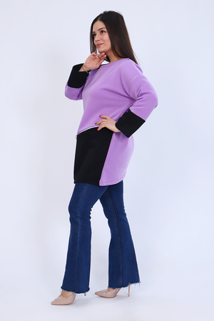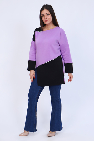 Туника женская, комбинированная, прямого силуэта, спущенный рукав 3/4 с широкими манжетами, длина рукава от шва. Горловина с обтачкой, справа декорирована втачной молнией. Фигурный v-образный низ декорирован вшивной молнией. Удобно и практично.