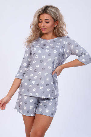 Женский домашний костюм-пижама с шортиками и лонгсливом из ткани нового поколения - термальсофта. Лонгслив свободного силуэта с рукавом длиной 3/4. Шорты классические без бокового шва, на широкой резинке, украшенной декоративным атласным бантиком по центру. Расширяются от верхней части бедра. Прекрасно подойдет беременным. Ткань костюма очень мягкая и нежная на ощупь, тонкая, но очень теплая, напоминает тонкую ангору, имеет высокие показатели эластичности, прекрасно сохраняет форму изделия. По ткани милый рисунок в виле лапок. Костюм очень комфортный и приятный к телу. Отличный подарок любимым по любому поводу!