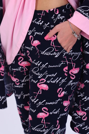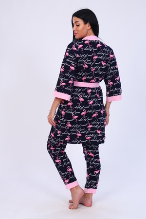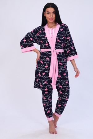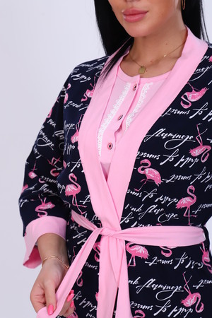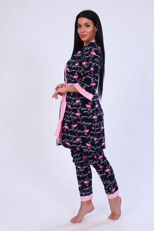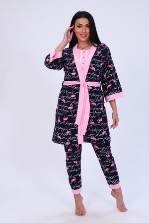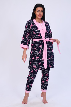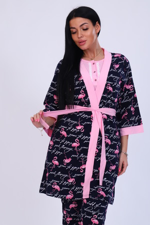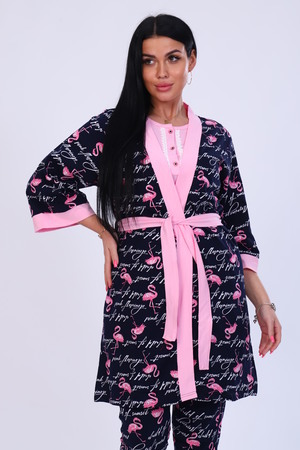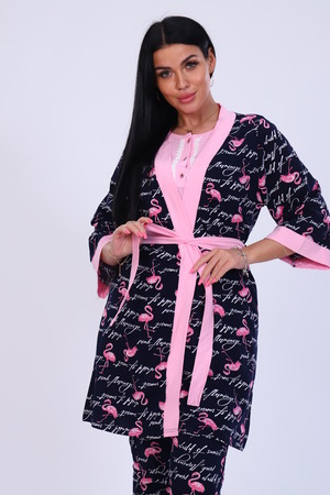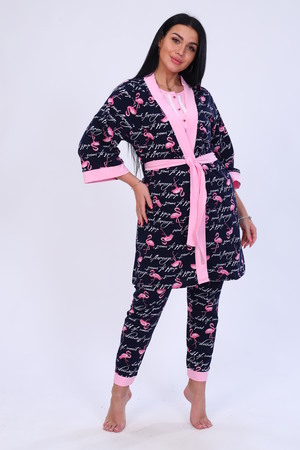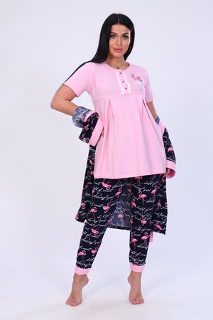 Пеньюар женский тройка состоит из халата на запах, удлиненной футболки на пуговицах и брюк с карманами. Халат на запах с поясом. Сорочка на пуговицах, расклешенная от груди. Брюки свободные с карманами, на манжетах. Пеньюар идеально подходит в роддом, и в последствии для домашнего использования. Пуговицы удобны для кормящих, свободный крой футболки позволяет носить пеньюар до 9 месяца, при этом он не будет сковывать движений и перетягивать. Яркий принт доставит радость в Ваш дом.