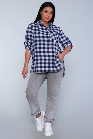 Повседневная, женская, туника свободного силуэта из набивного трикотажного полотна (штапель). Горловина круглая с отложным воротником. Спинка изделия, чуть длиннее полочки, низ изделия закруглен. На полочке рубашки расположен накладной нагрудный карман. Рукава укороченные, низ рукавов подобран на пату. Спинка цельнокроеная. Низ туники фигурный. Туника застегивается на пуговицы.